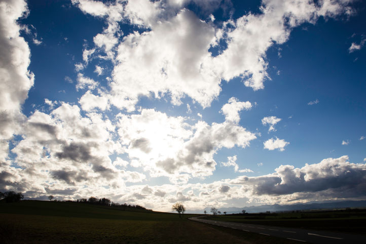 Le ciel est bleu, soleil se couche, les lourds nuages cotonneux m'accompagnent. Ce moment, c'est le mien, l'émotion me gagne, comme je l'aime cette nature, belle et douce nature.